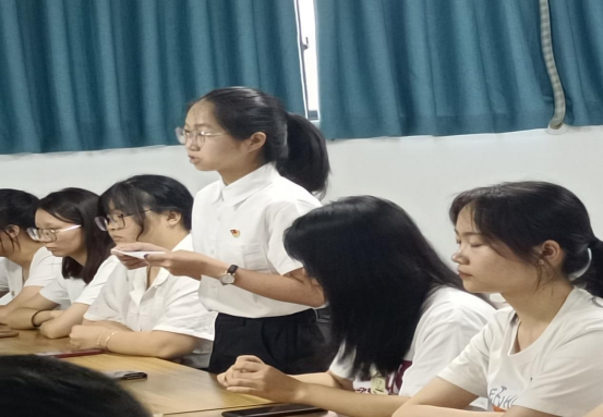 随后,参会成员就党课内容展开讨论,毕业生党员江愉书同学就本次活动分享了自己的想法。她表示,一要认清自己的党员身份,二要认清自己的职责,增强敢于担当的底气,三要积极作为、主动担当,做不负韶华的新时代青年。