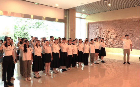随着参观讲解结束,全体成员返回大厅举行入党宣誓仪式,李瑞琦老师领誓。刘艺老师和毕业生党员为即将下点实习党员佩戴党徽,在革命先烈的见证下,英国365集团学生党员完成了新老传承。