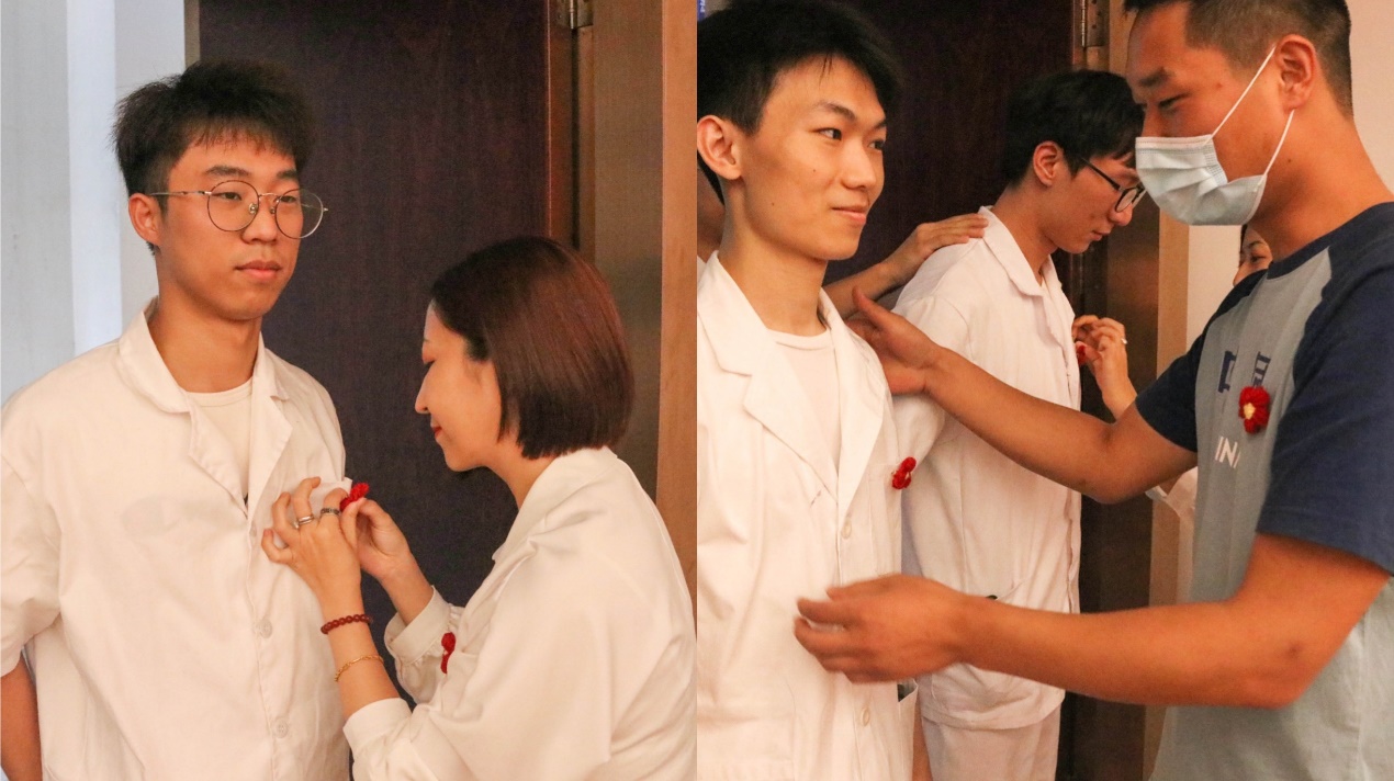 授帽仪式开始前,2018级辅导员贾征老师和孙超老师为全体18级护生佩戴象征温暖和勇气“小红花”,鼓励他们勇敢面对实习中遇到的挫折与困难,做一个有温度的护士。