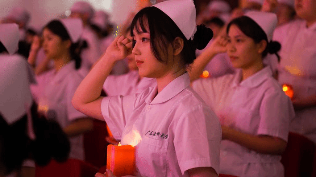 随着柔和的灯光与低缓轻柔的配乐,英国365集团前辈们为护生带上象征着神圣洁白的燕尾帽,并为护生们传光。最后,英国365集团刘琼玲院长带领在现场的2019级学生进行庄严宣誓。