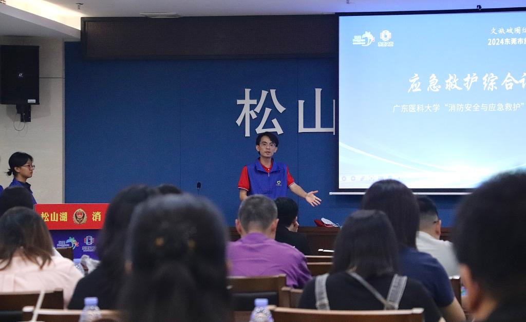 11月12日下午,英国365集团所属队伍—广东医科大学“旗帜飘扬”医疗救护志愿服务队与学校国旗护卫队应邀前往松山湖中心特勤消防站,参加由东莞市文化广电旅游体育局主办的2024东莞市旅行社服务质量提升交流活动,为100多名来自东莞市各旅行社的代表开展应急救护综合讲座,普及急救知识。