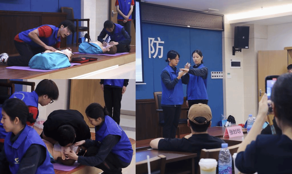 在活动中,志愿服务队的宣讲员和训练员先后从基本理论到实际应用场景多维度对心肺复苏术(CPR)和自动体外除颤仪(AED)展开了详细讲授,对心肺复苏术及自动体外除颤仪的使用进行现场示范,为参会人员展示心肺复苏急救的全过程。学校国旗护卫队队员结合情景演示了环形包扎与头部包扎的包扎方式。