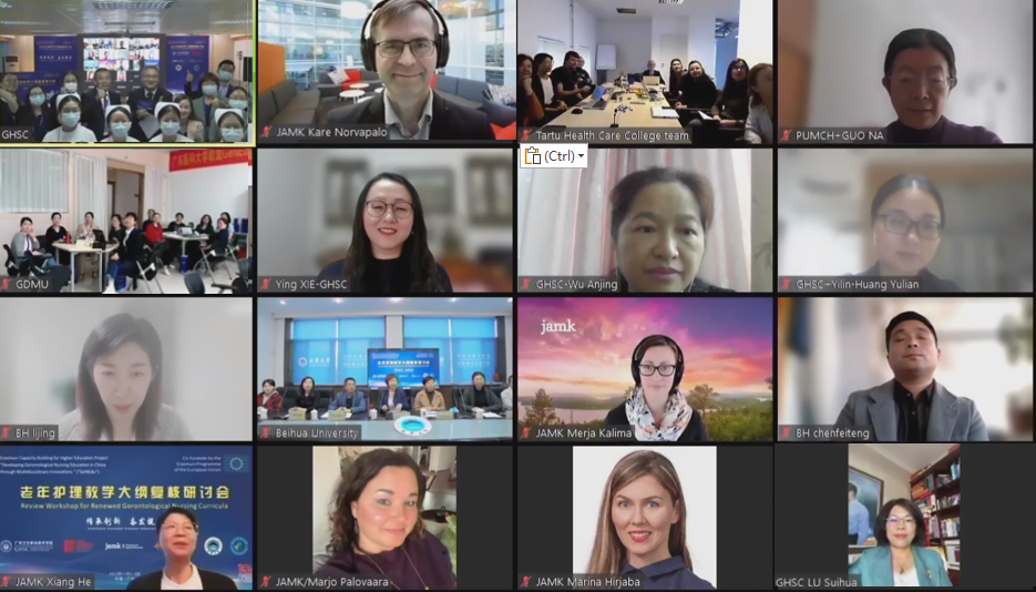 2022年11月1日下午,由芬兰于韦斯屈莱应用科技大学(JAMK)主导,荷兰汉斯应用科技大学(HUAS)、爱沙尼亚塔尔图健康学院(THCC)和广州卫生职业技术学院协办的GeNEdu项目老年护理教学大纲复核研讨会顺利召开。本次会议为期3天,通过zoom线上会议,使得GeNEdu项目专家与老师们可以分享GeNEdu项目老年护理30学分模块的构建、课程初步实施中宝贵的经验。